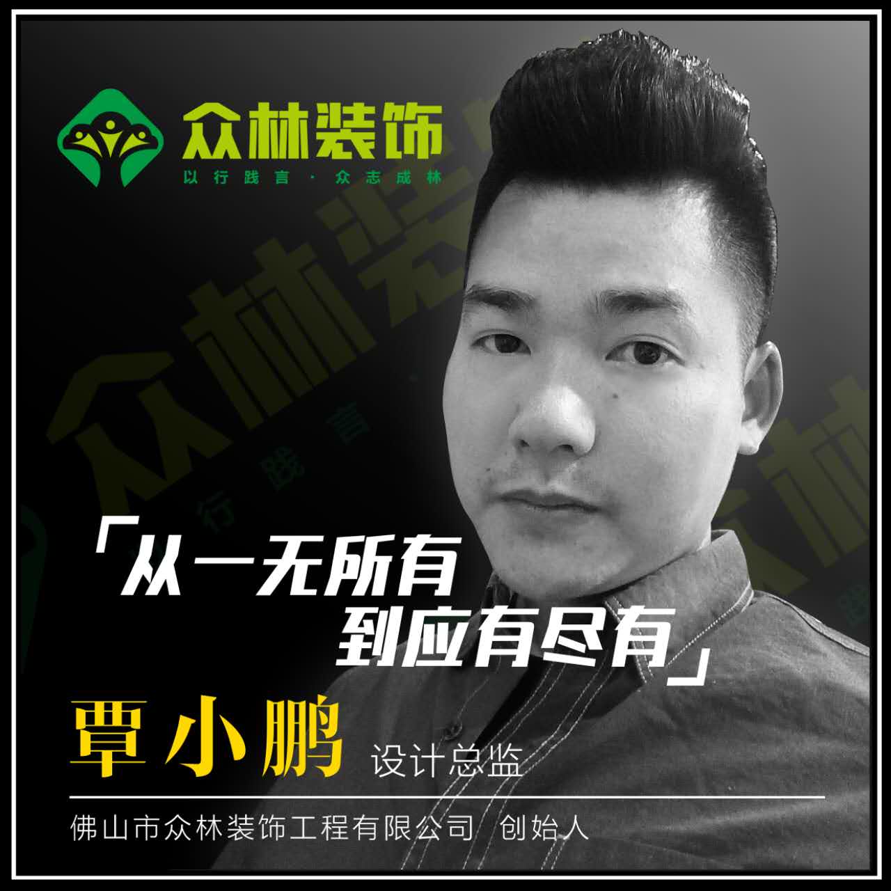 个人简介: 佛山众林装饰创始人,设计总监。设计理念:从一无所有,到应有尽有。
