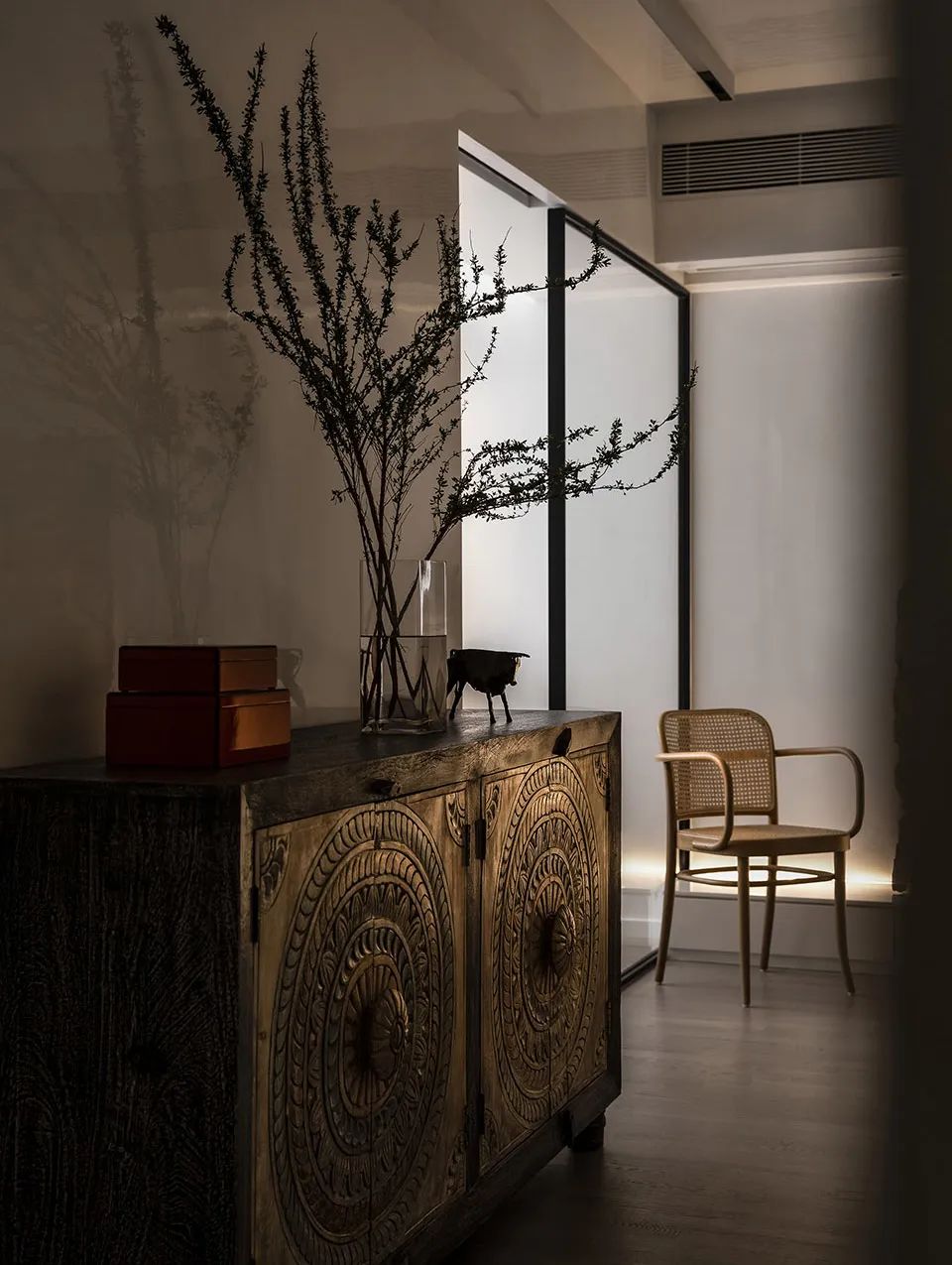 ▲在客厅一侧的过道摆了一个异域风格的小斗柜,摆上摆饰品与花瓶装饰,也为这个极简的空间增添了几分独特的设计氛围感。